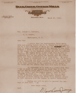 I notice that the Keating-Owen Child Labor Bill now pending before the U.S. Senate has been referred to a sub-committee of which you are a member. I desire to enter a protest against the passing of this bill because I think it will be an injury instead of a benefit to the people in the Southern states who will be affected by it. The cotton mills of the South will be able to overcome the affect it may have on them, but the real sufferers will be the people who depend upon the cotton mills and other industries for a livelihood..."